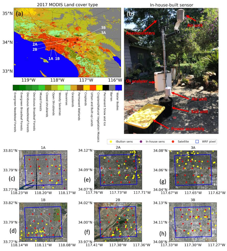 我們?cè)O(shè)計(jì)了我們的研究,以評(píng)估2017 年夏季從單個(gè)地塊到洛杉磯大都市區(qū)(圖 1a )的多個(gè)尺度的溫度和 O 3變化。我們圍繞單個(gè)社區(qū)組織了傳感器部署,我們將其定義為 4 × 4 km 2樣方. 密集的現(xiàn)場(chǎng)部署集中在加利福尼亞州長灘和內(nèi)陸帝國的各個(gè)部分(圖 1c-1h),這是洛杉磯大都市地區(qū)的一個(gè)子集,嚴(yán)重未達(dá)到 O 3. 部署持續(xù)時(shí)間分為三個(gè)活動(dòng)。在 2017 年 6 月至 7 月的第一次活動(dòng)中,六個(gè)傳感器節(jié)點(diǎn)被分布到長灘附近距離小于 20 公里的兩個(gè)樣方(每個(gè)樣方三個(gè)傳感器節(jié)點(diǎn))(例如,圖 1中的樣方 1A 和 1B) . 通過這種設(shè)計(jì),樣方大小可與空氣質(zhì)量模型和 EPA 排放清單的標(biāo)稱空間分辨率相媲美,后者通常為 4 × 4 km 2,而兩個(gè)樣方之間的距離可與 TROPOMI 足跡的尺寸相媲美( 4 × 7 公里2) 在最低點(diǎn)。因此,社區(qū)科學(xué)網(wǎng)絡(luò)的分布非常適合進(jìn)行測(cè)量,以解決有關(guān)亞網(wǎng)格尺度模型不確定性和亞像素分辨率衛(wèi)星檢索不確定性的問題。2017 年 7 月至 8 月的第二次活動(dòng)和 2017 年 8 月至 9 月的第三次活動(dòng)的部署與第一階段的部署類似,但針對(duì)克萊蒙特(圖 1中的 2A 和 2B )和圣貝納迪諾(3A)附近的不同樣方和3B),分別。當(dāng)兩個(gè)樣方在項(xiàng)目的每個(gè)階段配對(duì)以測(cè)量子區(qū)域梯度預(yù)期溫度和 O 3時(shí),項(xiàng)目所有三個(gè)階段中的鄰域?qū)Χ急贿x擇以共同反映區(qū)域梯度。